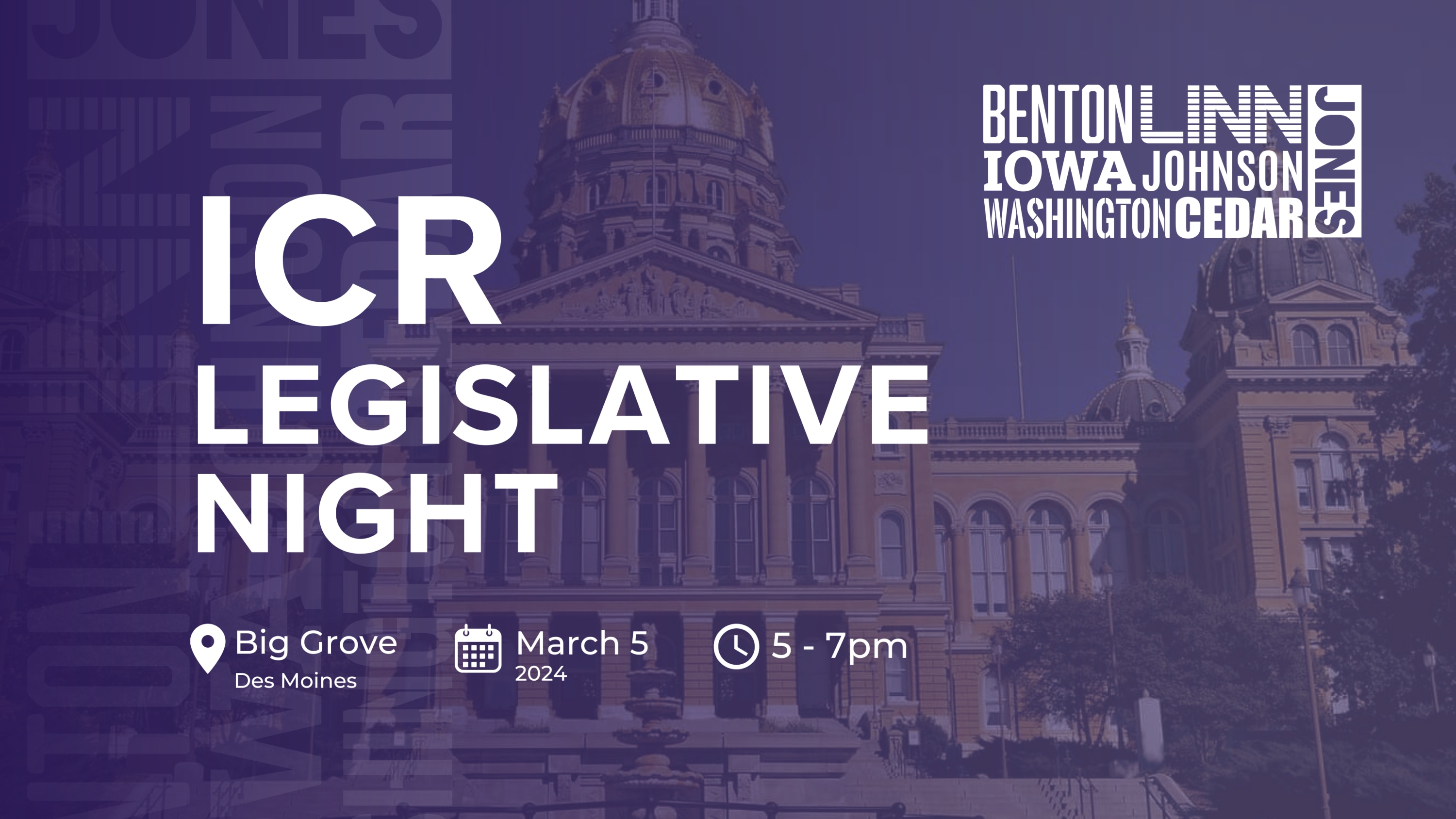 Enjoy a night of food and drinks from the ICR region to thank legislators for their service and bring awareness to the ICR region. The ICR region includes Iowa City & Cedar Rapids and covers Benton, Cedar, Iowa, Johnson, Jones, Linn, and Washington Counties.