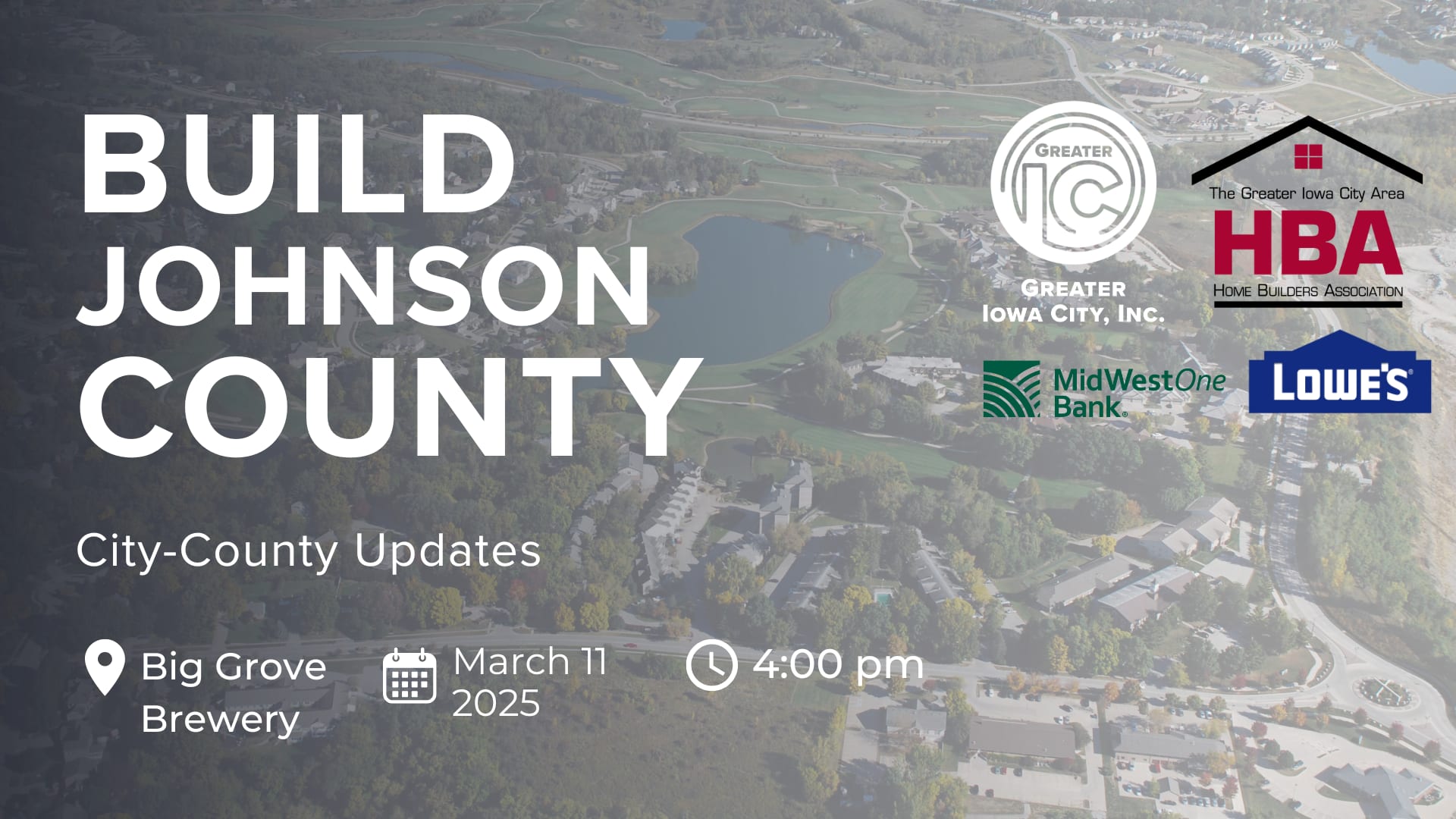 Join us on March 11th at 4:00 PM at Big Grove Brewery in Iowa City for the City-County Update, hosted by Greater Iowa City, Inc. and The Greater Iowa City Area Home Builders Association. Together, we’ll discuss smarter work strategies, shared resources, and opportunities for collaboration within the greater Johnson County region.