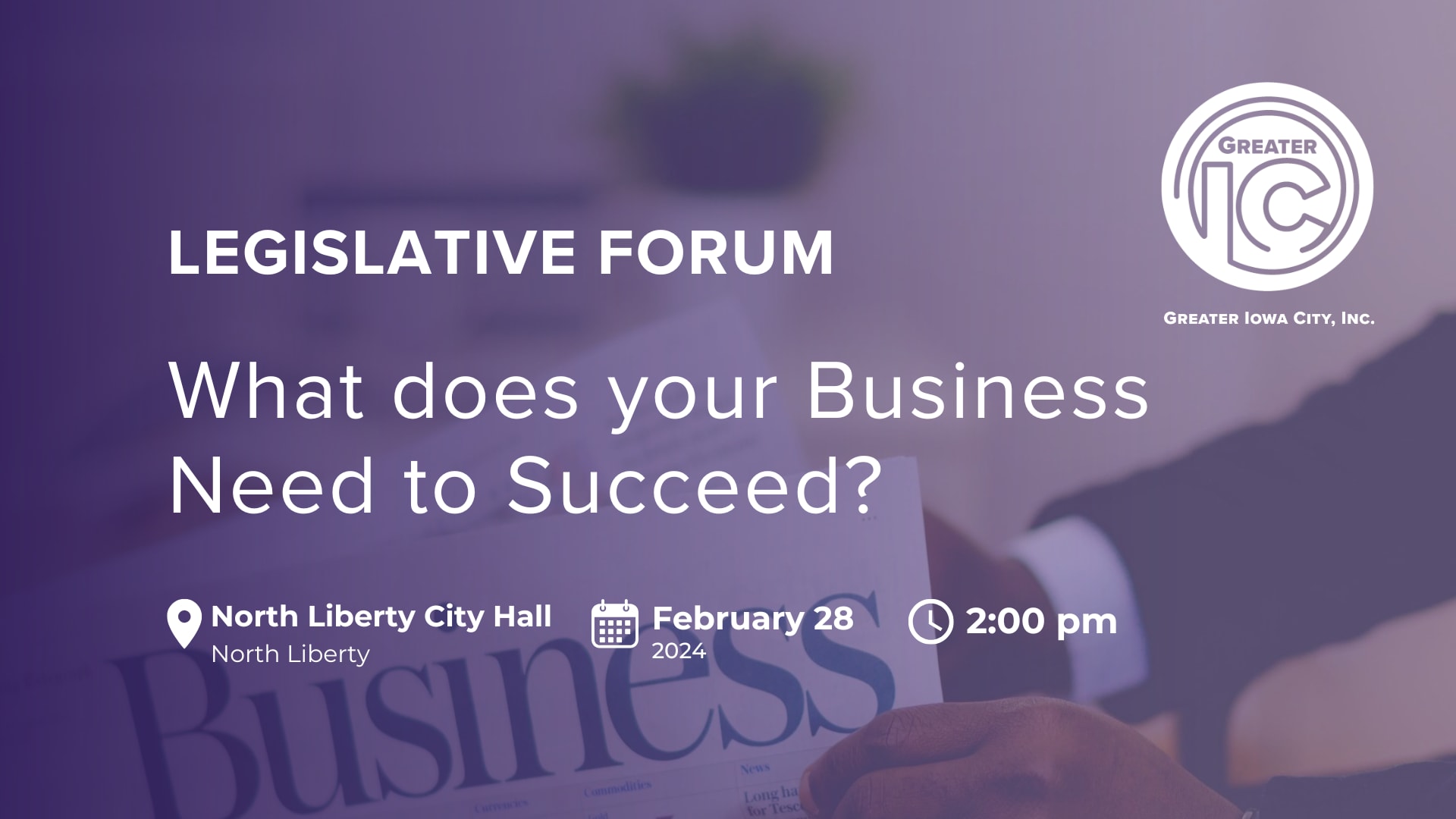 Greater Iowa City, Inc. invites you to participate in a series of three legislative forums with our elected officials during the 2025 legislative session.